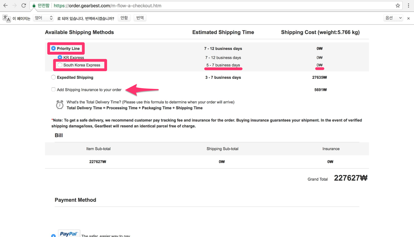 먼저 주소를 확인한 후 다음으로 배송 방법이 나오는데요. 다른 리뷰들에서 확인해본 바로는, 스크린샷에 표시해둔 ‘Priority Line’의 ‘South Korea Express’가 정석인 것 같습니다.