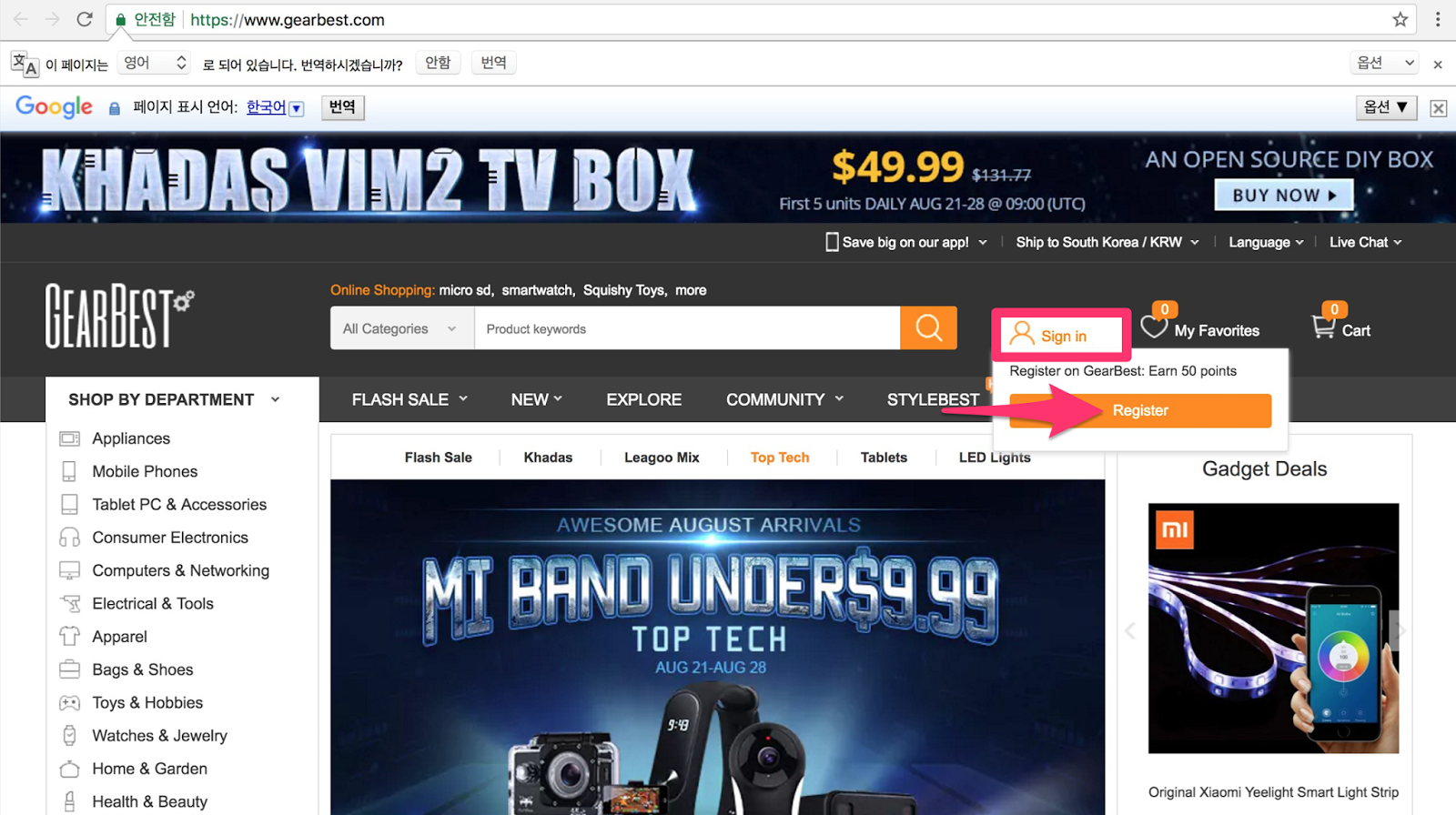 기어베스트는 구글이나 네이버에 검색해보면 쉽게 사이트를 찾을 수 있는데, 문제는 사이트가 자체적으로 한국어를 지원하지는 않는다는 것입니다.