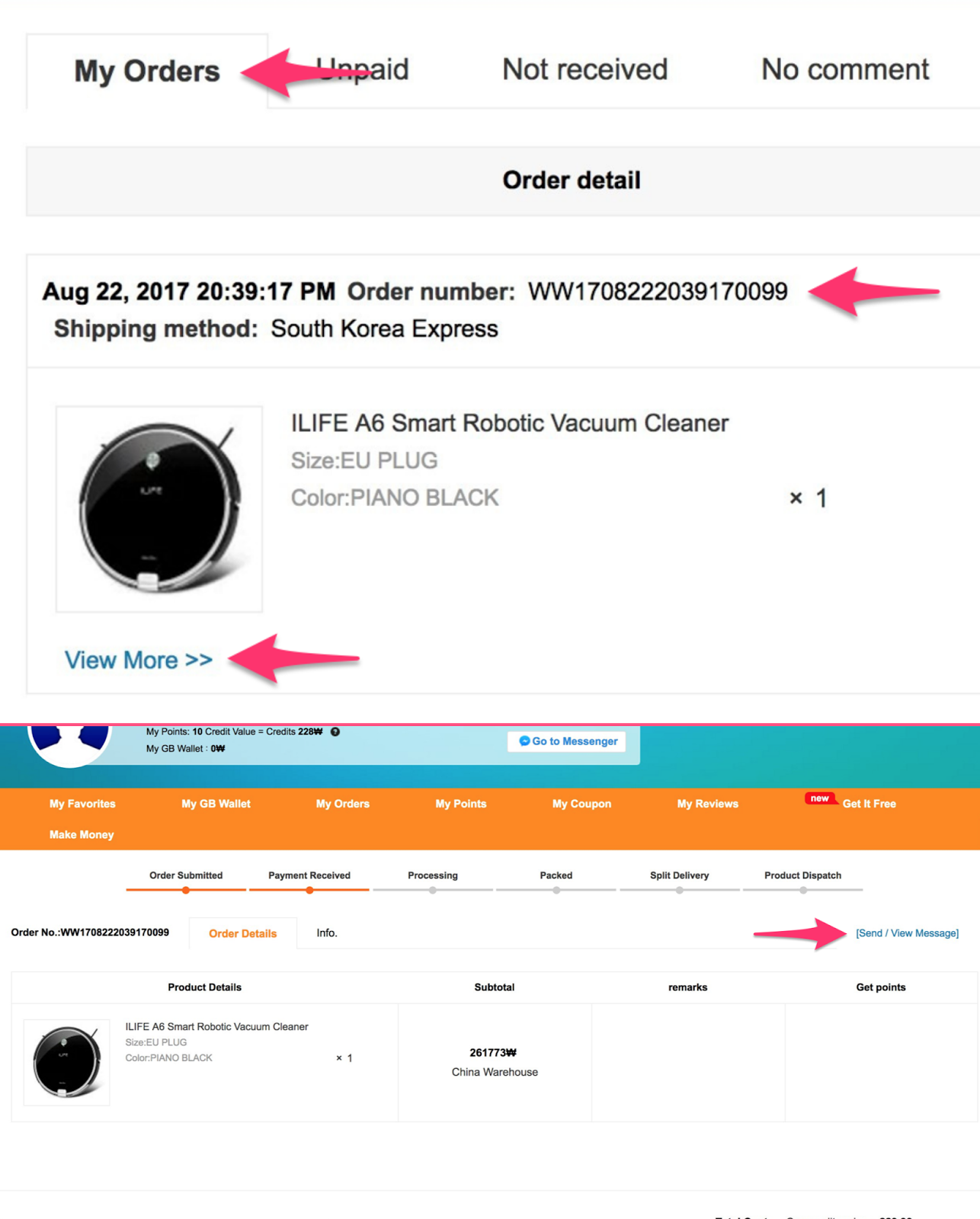 My order 항목에서 제품의 주문 번호를 클릭하고, [Send / View Massage]를 누릅니다.