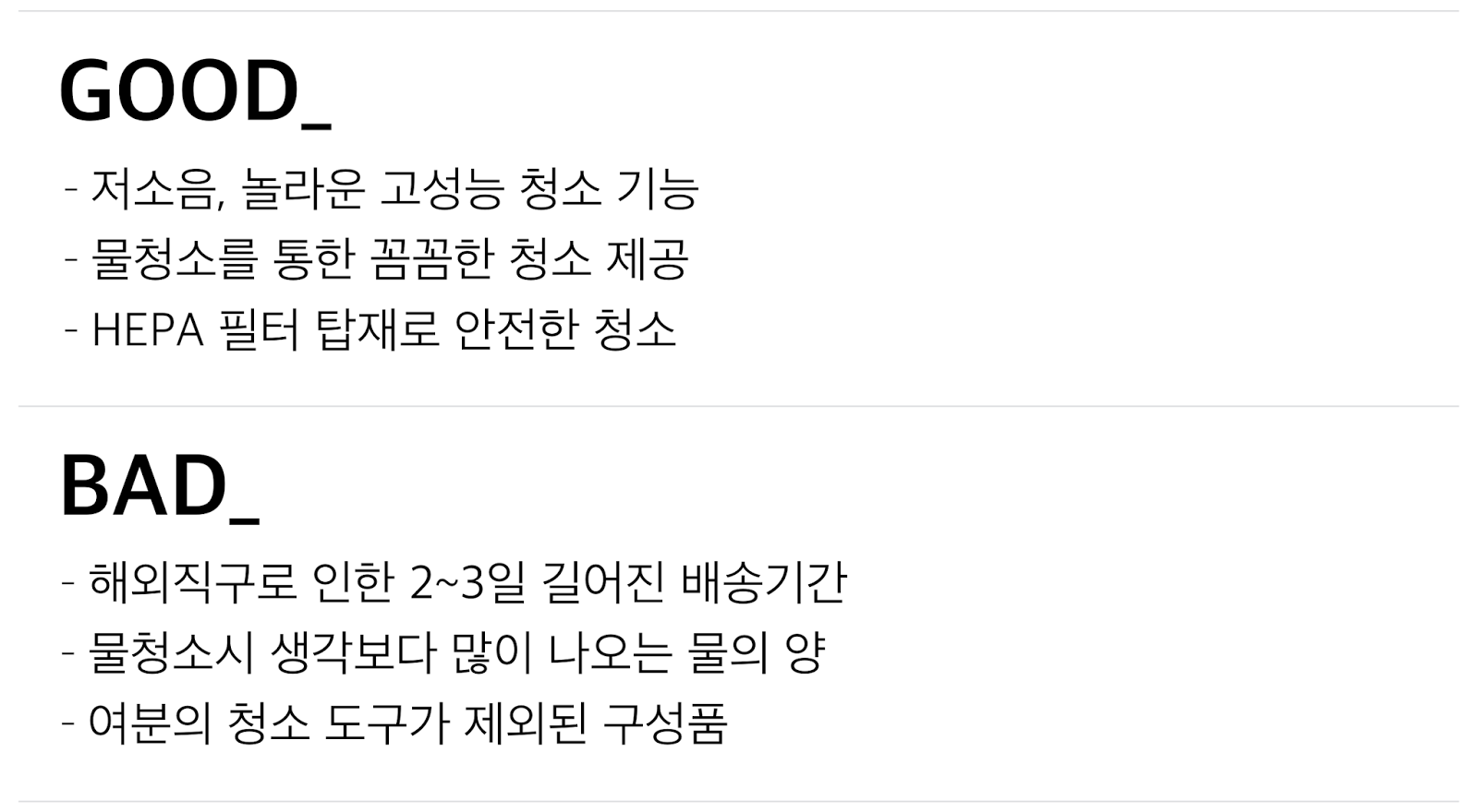 우선, 청소 기능이 뛰어날 뿐 아니라 바로 물청소까지 해줬기 때문에 그 점에서 청소 시간을 단축시켜 주기도 했고, 물탱크를 통해서 자동 급수를 지원해줘서 그 점에서도 물을 자주자주 넣어줄 필요가 없다는 장점이 있었는데요.