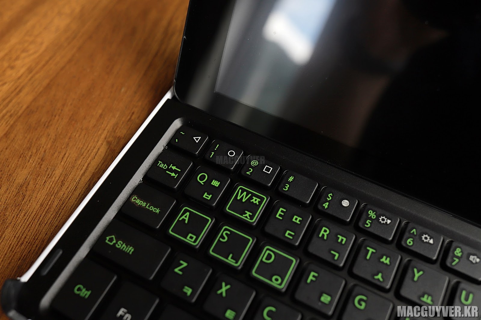 앞서 언급된 스펙에 더해, 레볼루션 A8은 키보드를 제공하는데요. 노 페어링 기술을 적용해서 페어링에 대한 스트레스를 줄여주기도 했고, 무전원 방식으로 충전에 대한 부담도 없었습니다. WASD 버튼을 강조하는 디자인으로 게이밍 태블릿임을 직간접적으로 드러내기도 했는데요.
