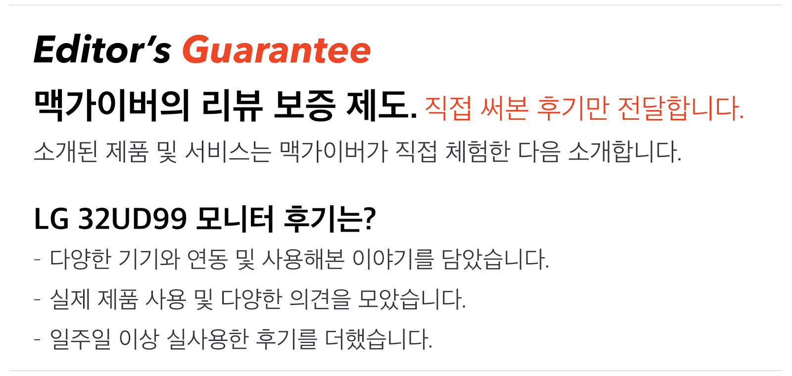 프리미엄 제품을 찾는 분들의 눈높이를 충족시켜줄 탄탄한 기본기를 바탕으로 완성된 LG 32UD99 4K 모니터를 통해서 다양한 작업을 있는 그대로, 100% 컬러감 그대로 활용해보는 것도 좋을 것 같습니다. 엔터테인먼트를 즐기기에도 손색이 없는 LG 32UD99 4K 모니터였습니다. - MACGUYVER.