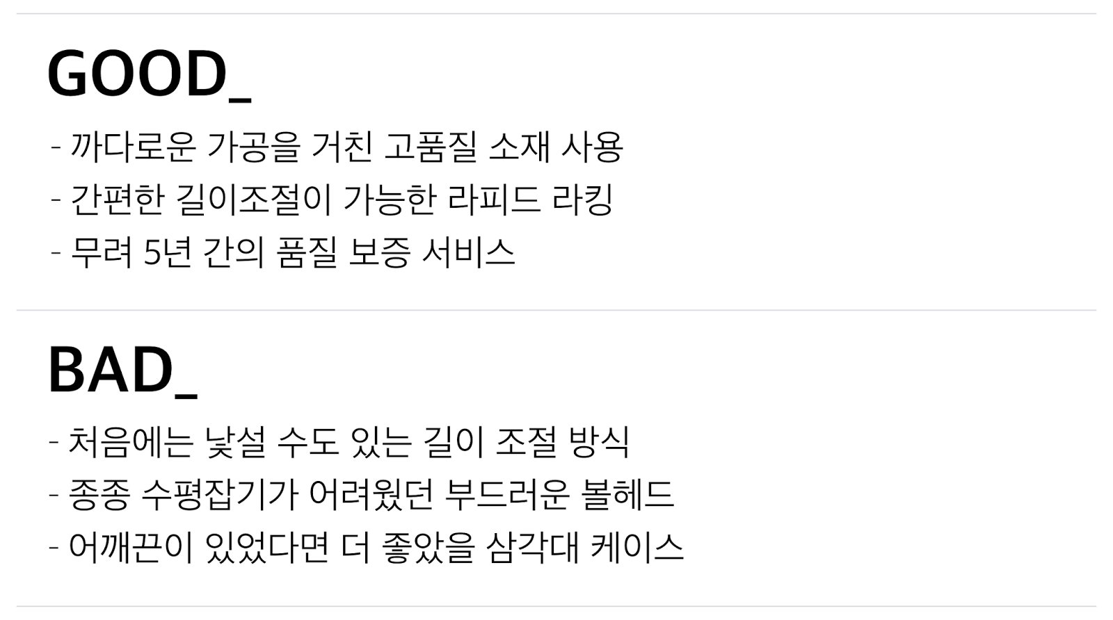 또, 볼헤드가 너무 부드럽다 보니 수평을 맞추다가 삐끗하는 경우도 종종 있었습니다. 누군가에게는 길이 조절 방식이 익숙지 않아 초반엔 어려울 수도 있겠네요.