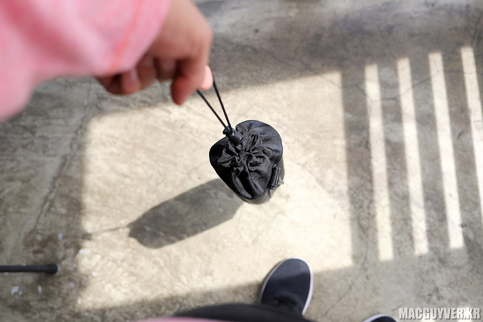접으면 35cm 정도 밖에 되지 않고 별도의 케이스에는 스트랩이 포함되어 있어서, 직접 휴대할 때는 팔에 걸고 다니니 전혀 불편하지 않았습니다. 또 케이스에 후크가 있어서 원한다면 가방에 걸어둘 수도 있었습니다.