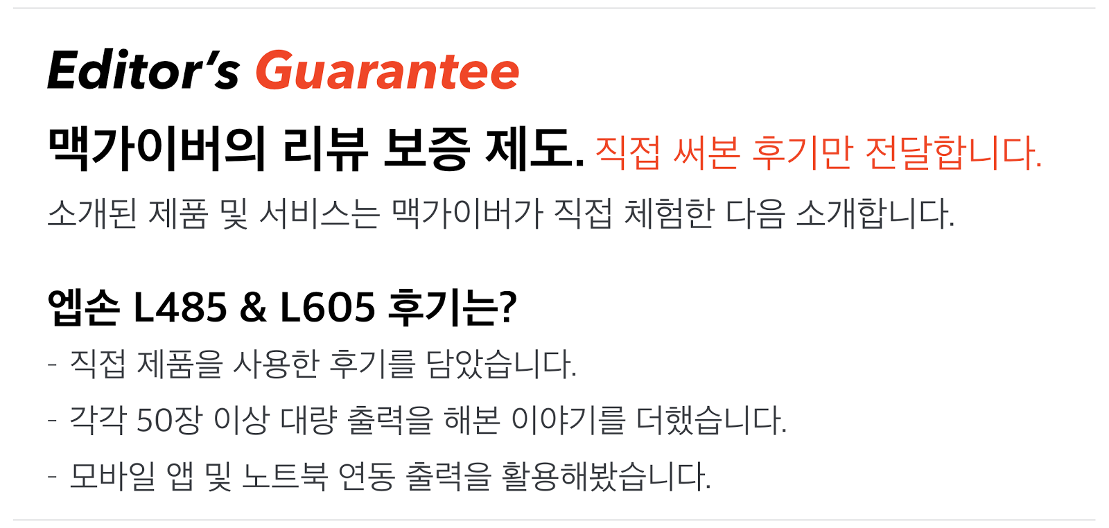 물론, 잉크젯의 특성상 장기간 사용하지 않을 경우 헤드가 막힐 수 있는 만큼 일주일에 한 번 이상은 인쇄를 해주는 것이 좋다는 점은 기억할 필요가 있을 것 같습니다. 헤드가 다른 엡손 정품 무한 잉크젯 복합기 L485 & L605를 활용한다면 가정이나 사무실에서의 활용도가 더욱 높아질지도 모르겠습니다. - MACGUYVER.