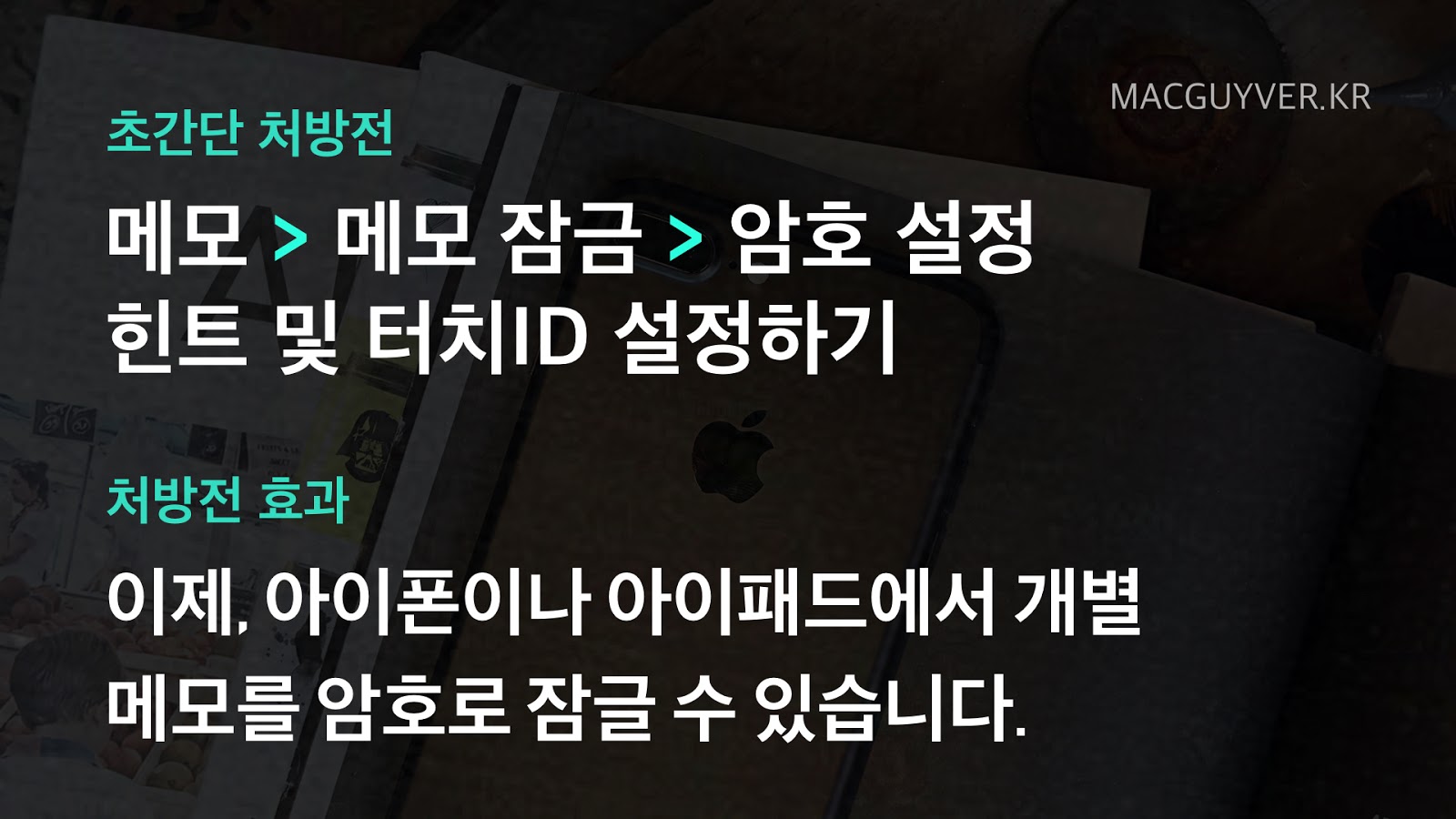 잠긴 메모 기능은 iOS 9.3 이상, OS X 10.11.4 버전 이상에서만 보고 수정할 수 있기 때문에 잠긴 메모를 활용하고 싶은 모든 기기의 운영체제 버전을 확인한 다음에 사용하는 것이 좋습니다. 이제, 메모 잠그기 기능을 활용해서 나만의 메모를 만들어서 활용해보는 것도 좋을 것 같네요. - MACGUYVER.