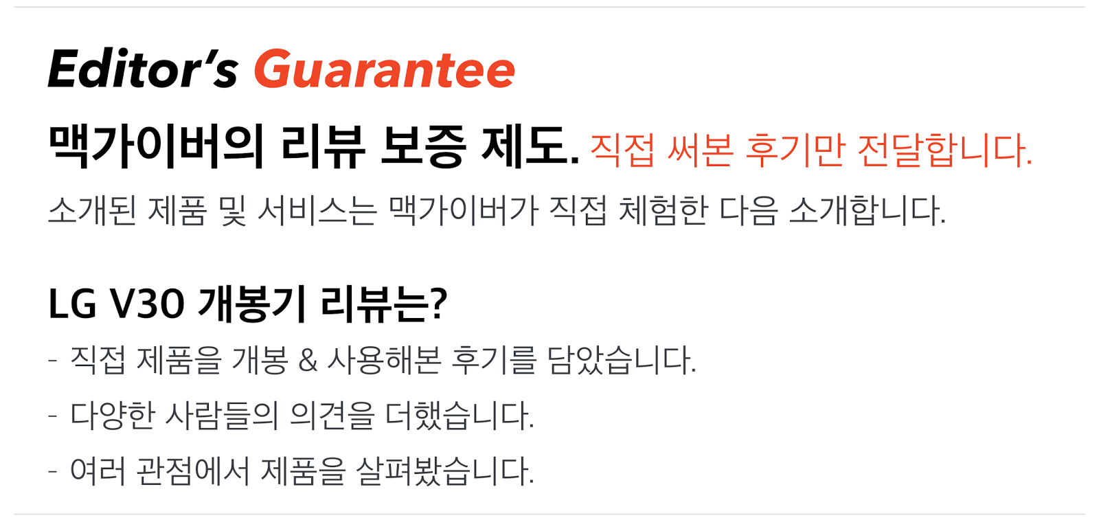 이제, 계속해서 V30를 사용하면서 어떠한 매력이 더 있는지, 어떠한 아쉬움을 가졌는지 더욱 생생하게 살펴보도록 하겠습니다. - MACGUYVER.