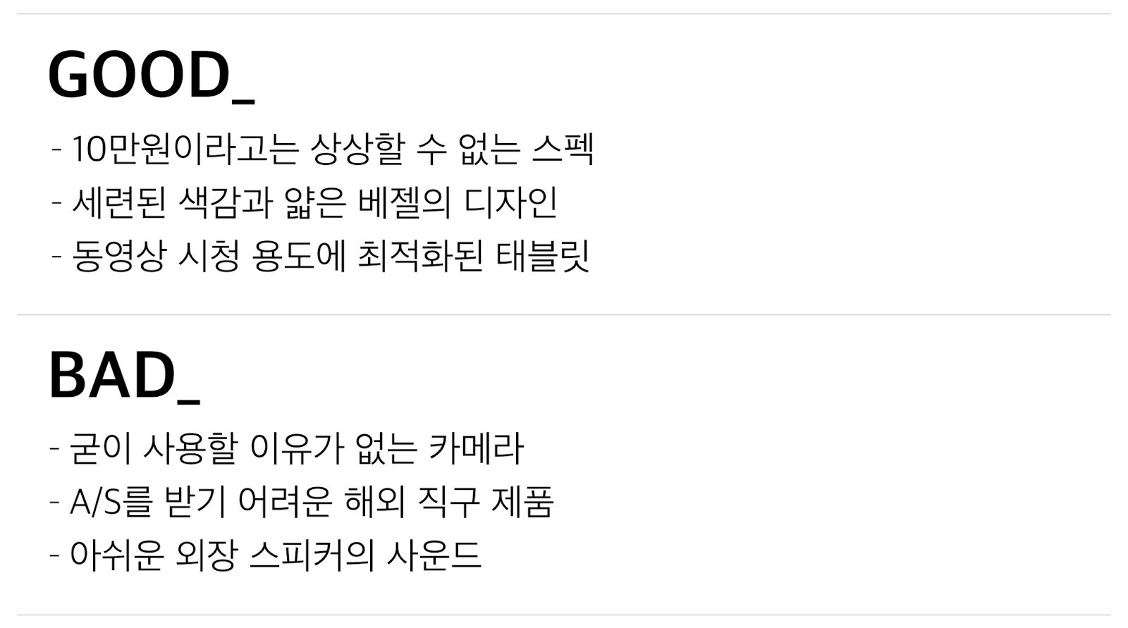 저가 태블릿의 스펙이 얼마나 뛰어난 지보다는 자신에게 치명적일 수 있는 단점을 품고 있는지 없는지를 우선 알아보는 것이 중요하기 때문입니다. 몇몇 단점들이 자신에게는 크게 문제가 되지 않는다면 구입해도 괜찮겠죠.