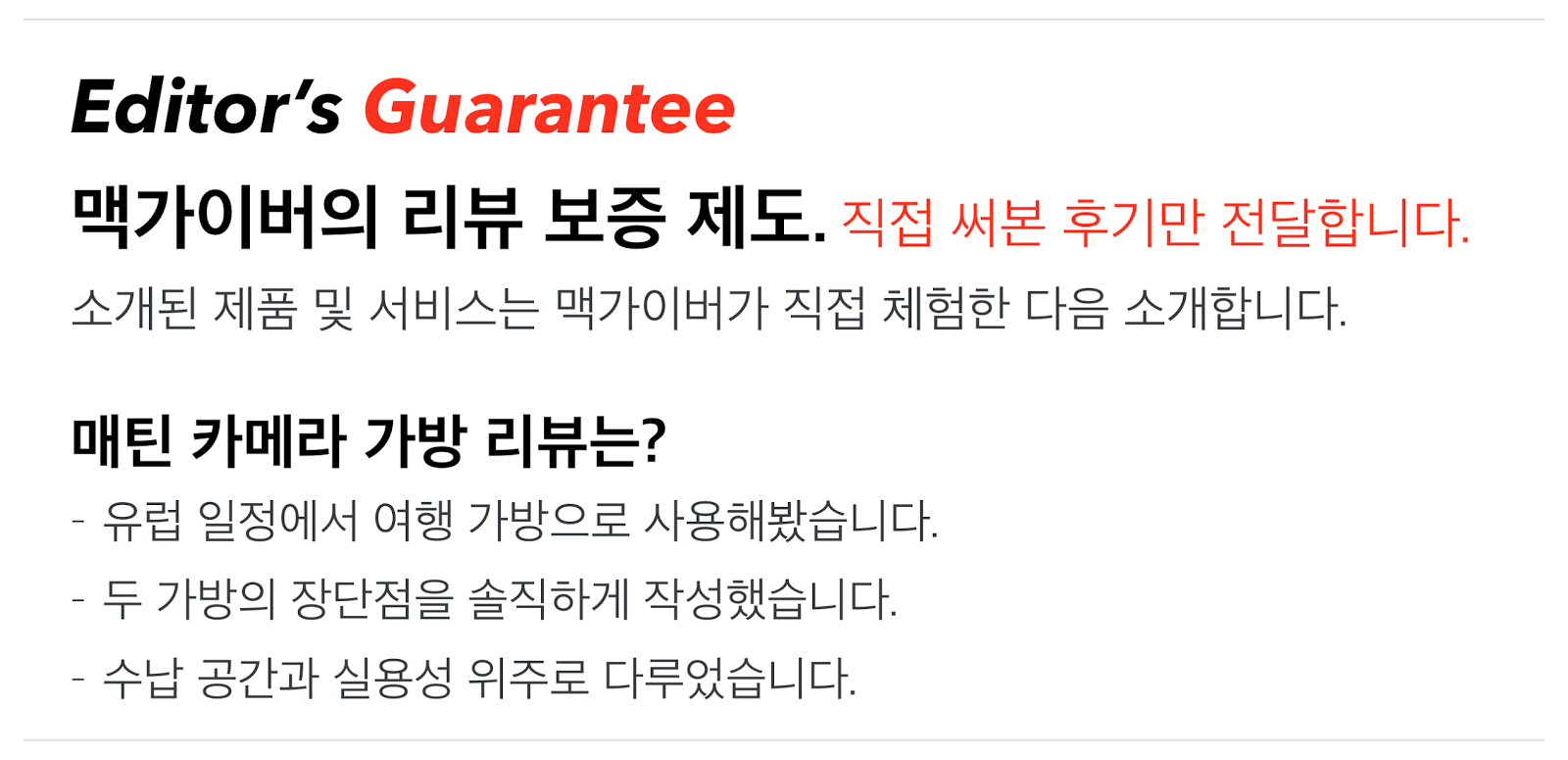 또한 완성도가 높음에도 합리적인 가격을 품고 있기 때문에 DSLR과 카메라 렌즈를 위한 가방을 찾고 있는 분들께 좋은 선택지가 되지 않을까 싶습니다. - MACGUYVER.