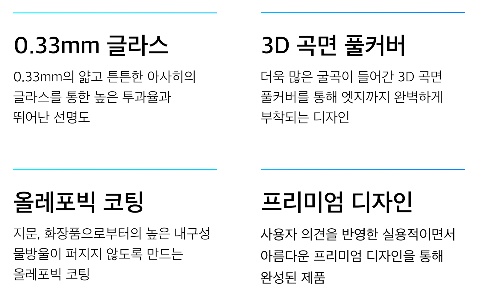 글라스는 0.33mm의 아사히 글라스를 채택해서 투과율이나 터치감이 높을 뿐 아니라 올레포빅 코팅을 통해 지문이나 화장품이 묻어나더라도 쉽게 닦을 수 있고, 물이 묻더라도 퍼지지 않고 방울져서 쉽게 털어낼 수 있는 장점까지 더하고 있다.