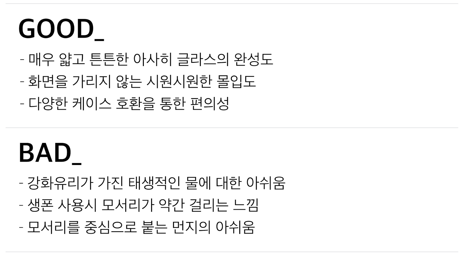 B. 전체적으로는 만족도가 상당히 높았는데요. 특히나 터치감이 인상적이었던 것 같네요. 하지만 역시나 생폰에 강화유리만 부착하니까 상대적으로 강화유리의 모서리 부분이 손에 걸리는 것은 태생적인 한계가 아닐까 싶었습니다.