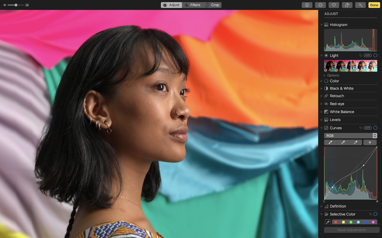 이외에도 커브스 기능으로 자연스럽고 직관적으로 색상, 명암비를 조절하거나 색상을 선택하는 툴을 개선해서 범위 내에서의 색상 조절 기능까지 더했다.