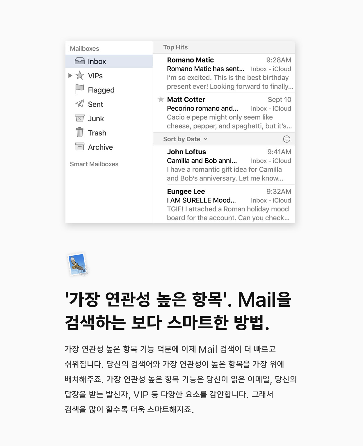 다음으로 메일을 살펴보자. 맥북과 아이맥에서의 메일은 매우 유용하면서도 쓰임새가 많은 기능 가운데 하나였는데, 이번 Mac OS 하이 시에라에서의 메일은 학습 기능까지 더하며 더욱 똑똑해졌다.