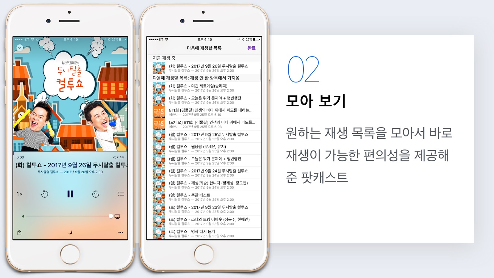 이를테면, 팟캐스트를 통해서 즐겨 듣는 라디오 방송을 몰아서 재생하거나, 잠이 올 경우라면 두시 탈출 컬투쇼 베스트 에피소드만 모아서 듣는 것과 같은 방식으로 졸음을 떨칠 수도 있어서 매우 편리하고 다재다능하다.