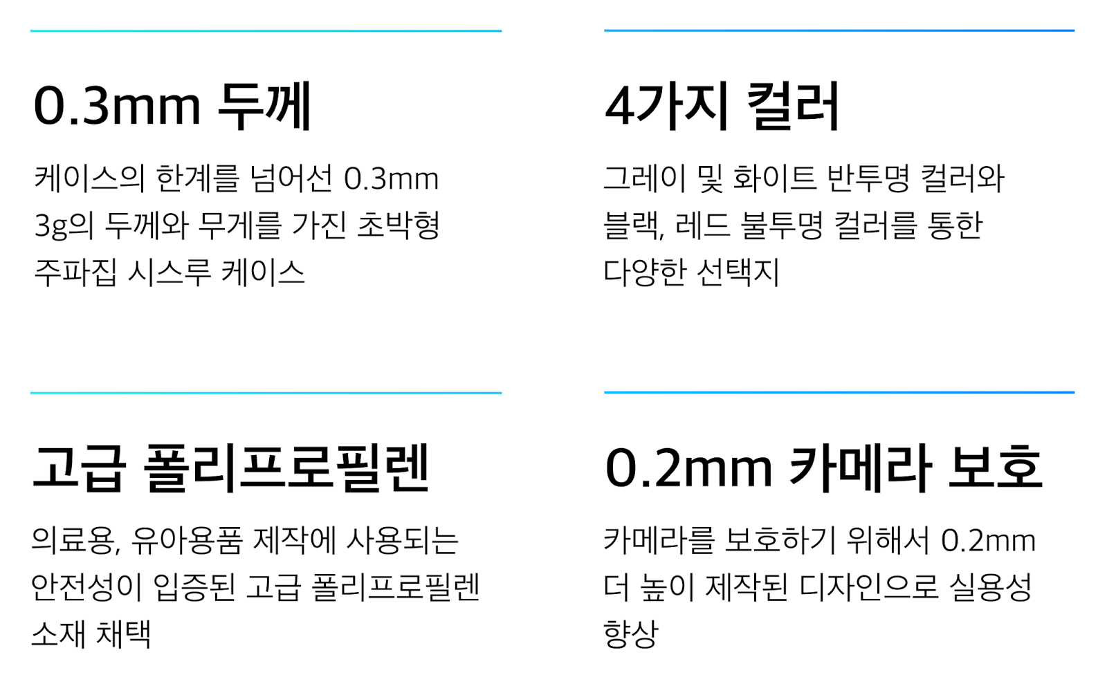 결과 0.3mm의 매우 얇은 두께를 가진 초박형의 시스루 케이스가 탄생되었고, 3g에 불과한 무게로 사실상 무게를 신경 쓰지 않아도 되는 차별점도 선보였다.