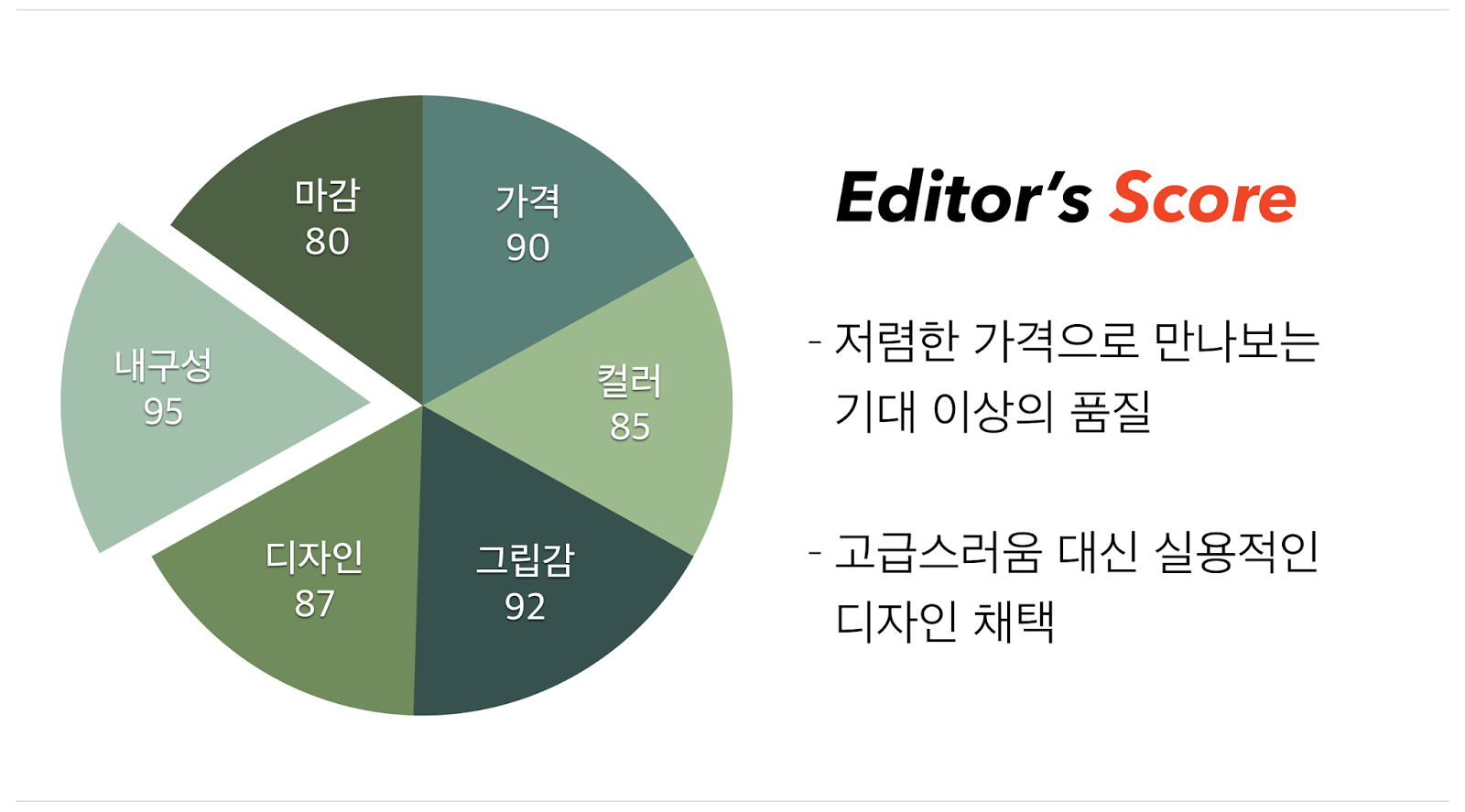 그러나 장점이라고 한다면, 우선 모서리 처리가 매우 잘 되어 있어서 일부 제품들처럼 손에 상처를 내거나 불편함을 주는 마감이 아니라는 점에서 매우 편리한 사용이 가능했고, 색감 역시 매우 고급스러워서 레드의 경우도 검빨로 사용할 수 있을 정도로 매력적이기도 했다.