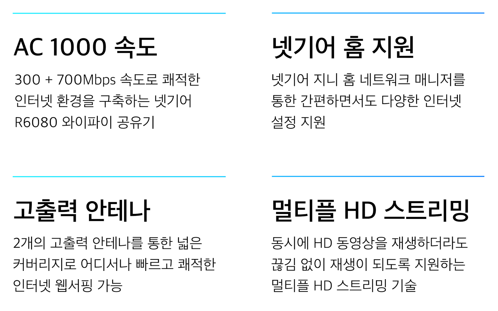 무엇보다, 빠른 속도를 유지하고 있다는 것이 넷기어 R6080 무선 와이파이 공유기만의 장점이 아닐까 싶었는데, 통합 AC를 통해서 최대 300 + 700Mbps의 속도를 지원하기 때문에 쾌적한 인터넷 웹서핑이 가능해진다.