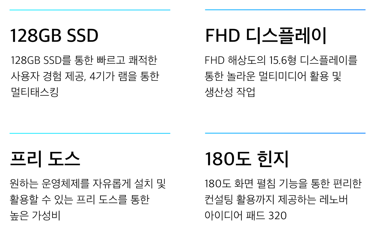 그럼에도 레노버 아이디어 패드 (IDEAPAD 320-15IAP) 모델은 180도로 펼쳐지는 힌지 구조를 통해서 함께 회의를 할 수도 있었고, 준수한 성능의 대화면을 경험할 수 있을 뿐 아니라 무려 3년에 이르는 제한 보증을 적용했기 때문에 오랫동안 사용하기에도 충분한 매력을 가진 제품이 아닐까 싶었다.