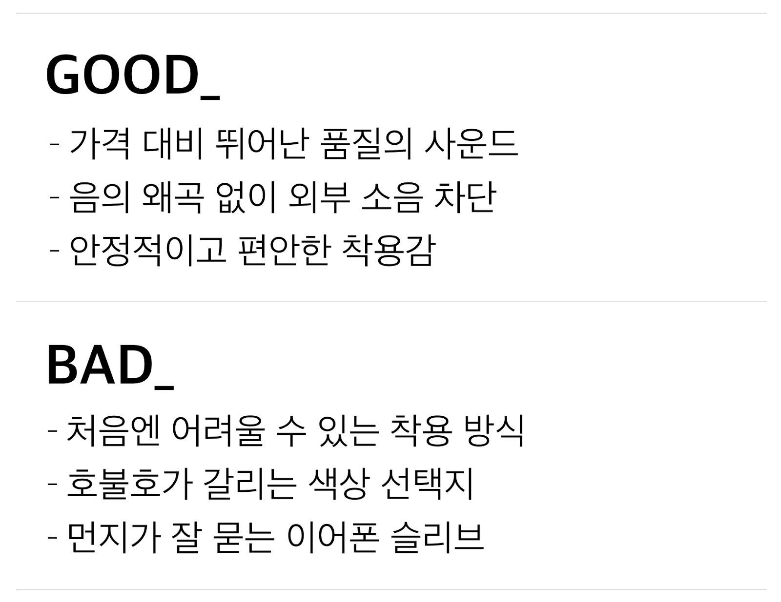 또 이러한 인이어 이어폰의 착용 방법이 익숙지 않은 사람에게는 처음에 착용하는 데 꽤 어려움을 겪을 수 있다는 점도 감안해야 할 듯 싶다.