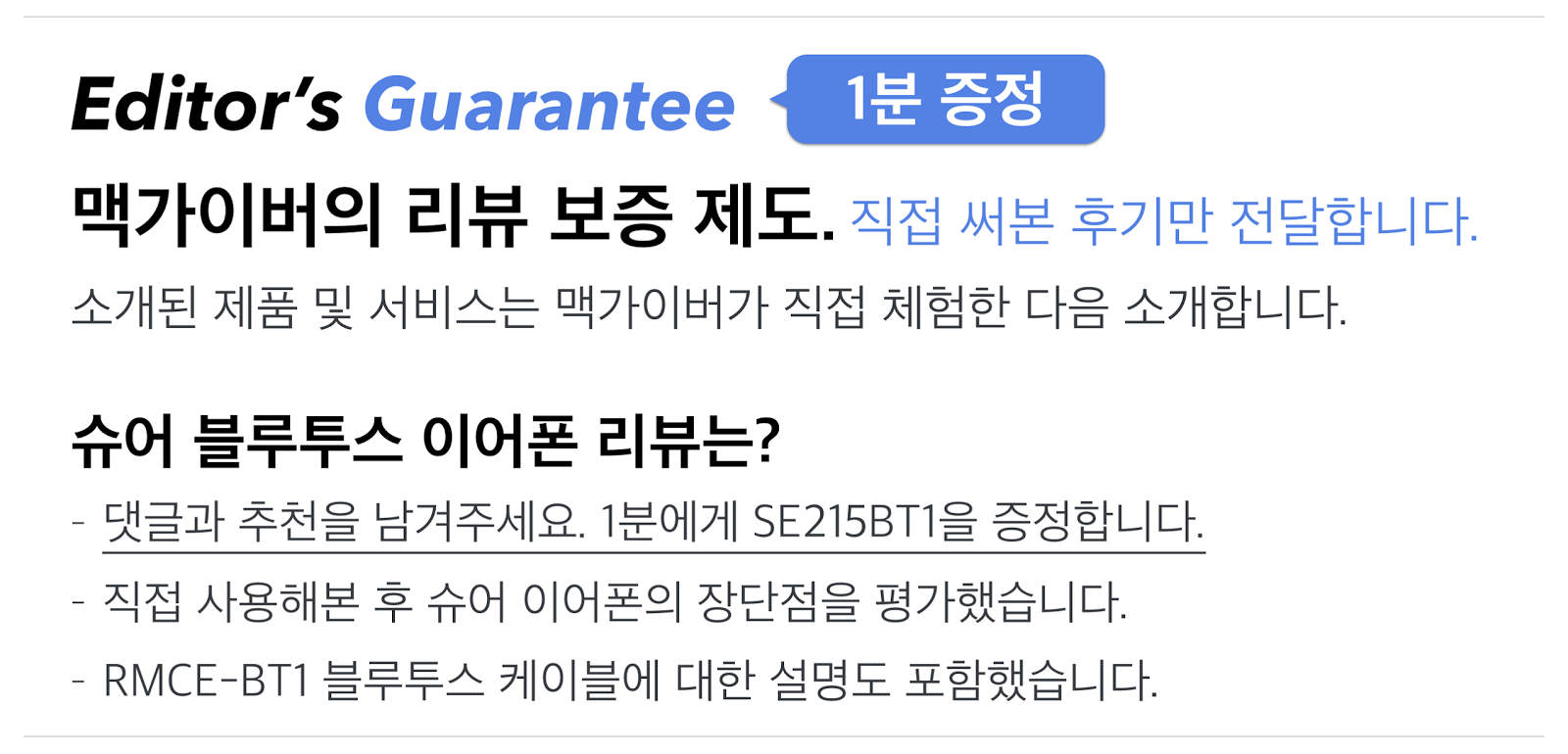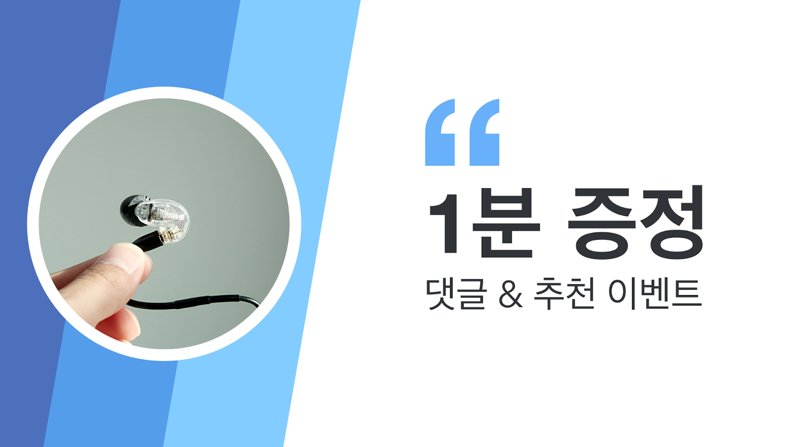 그리고 이 고음질 블루투스 이어폰의 케이블이 고장 났을 경우 MMCX 단자가 도입되어 있기 때문에 케이블만 교체할 수도 있고, 마지막으로, 증정 이벤트가 진행 중이니 참고하길 바란다.