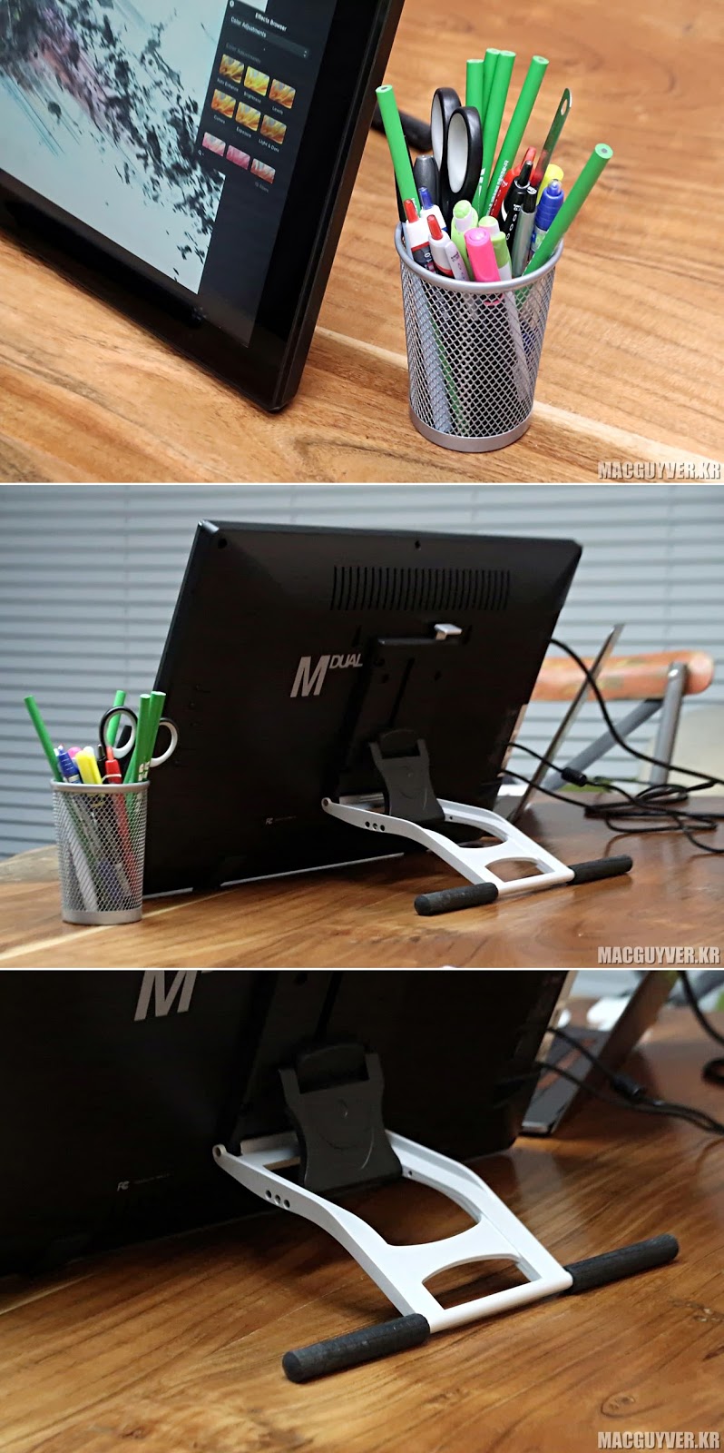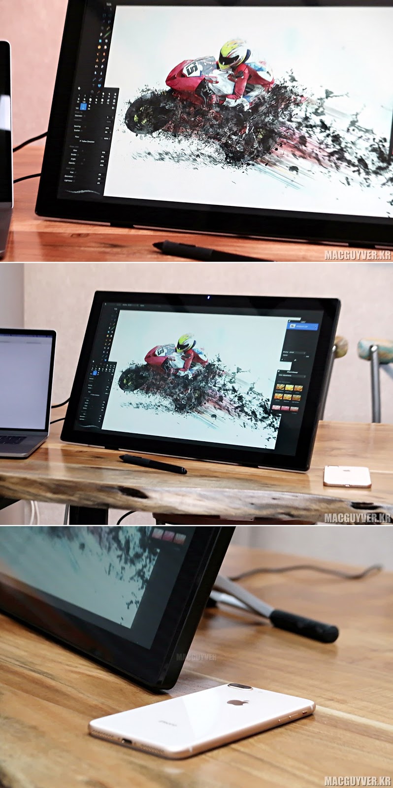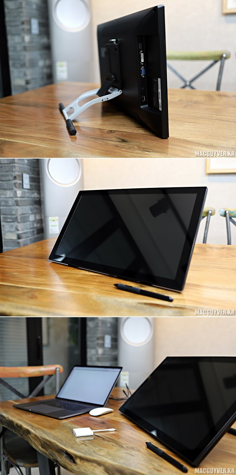 이를테면, 평소에는 거의 눕혀둔 상황에서 스케치를 하다가, 함께 그림을 검토하려는 경우라면 한손으로 바로바로 세워서 검토할 수 있고, 또 프레젠테이션을 하거나 동영상을 보려는 경우라면 더 세워서 거의 직각으로 만들 수도 있기 때문에 편의성 측면에서 큰 장점이 되어준 것이다.