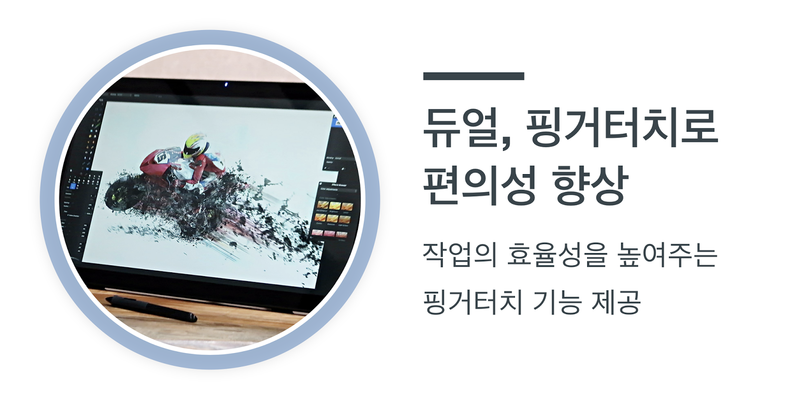 이 기능이 가진 큰 장점이라면 시간을 줄일 수 있다는 것이 있고, 작업에 있어서 동선을 줄여주기 때문에 작업 시간을 크게 줄일 수 있다는 것이 있다. 결과적으로 놀라운 화면과 세밀한 그립펜에 더해서 듀얼터치 및 핑거터치 기능을 통한 작업 효율성까지 높일 수 있다는 것이다.