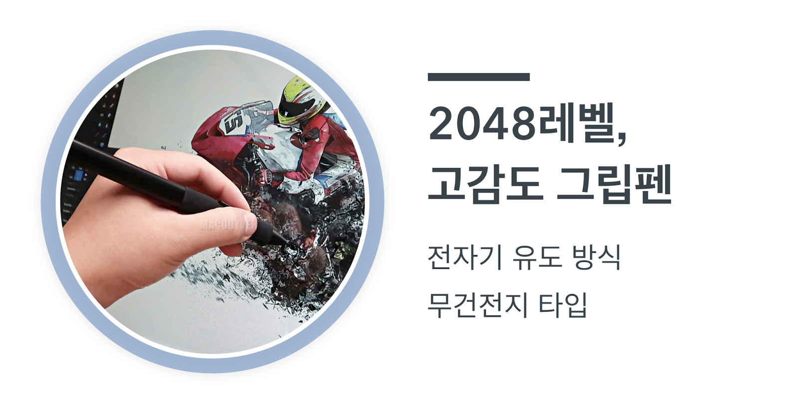 장은테크 MINE-JET220D 액정타블렛 (디지타이저)는 자체적으로 2048레벨의 세밀한 고감도 압력감지 그립펜이 제공되는데, 전자기 유도 방식이기 때문에 무건전지 타입의 그립펜으로서 유지비용이 없을 뿐 아니라 충전을 위해서 꽂아줄 필요도 없는 편의성을 제공해줬다.