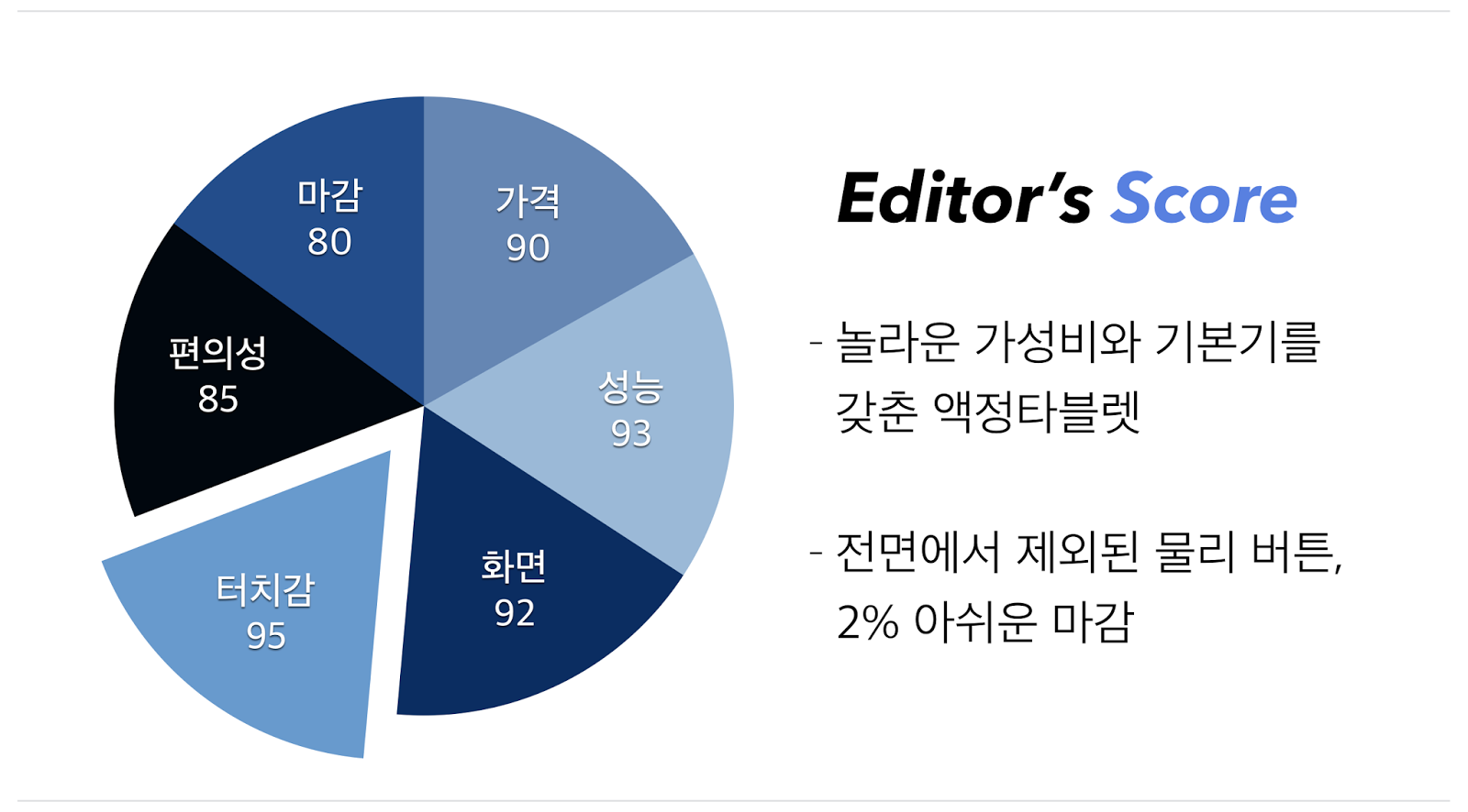 하지만 전면 물리 버튼을 원했던 분들이라면 약간은 아쉬움이 될지도 모른다. 또한 화면의 품질은 매우 뛰어나지만 빛 반사가 약간 있기 때문에 경우에 따라서는 빛이 반사될 수 있다는 점도 감안할 필요가 있다. 각도 조절 및 커텐을 활용해서 빛을 줄이는 것은 가능하지만 자체적인 빛 반사는 알아둬야 하는 것이다.