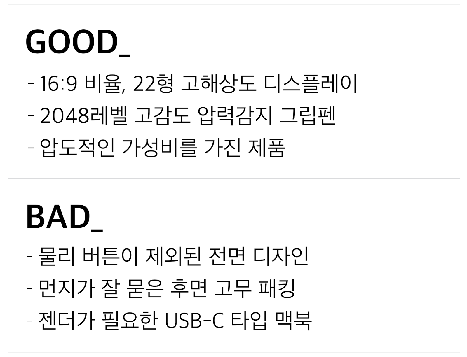 그러나 장은테크 MINE-JET220D 액정타블렛 (디지타이저)는 놀라운 가성비를 가졌기 때문에 앞서 소개된 모든 기능들을 타 제품과 비교해서 반값에서 그 이상 더 저렴하게 활용할 수 있다는 점에서 소소한 단점들이 크게 다가오지 않기도 했다.