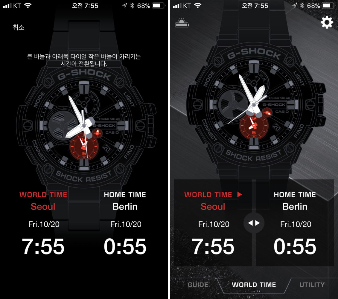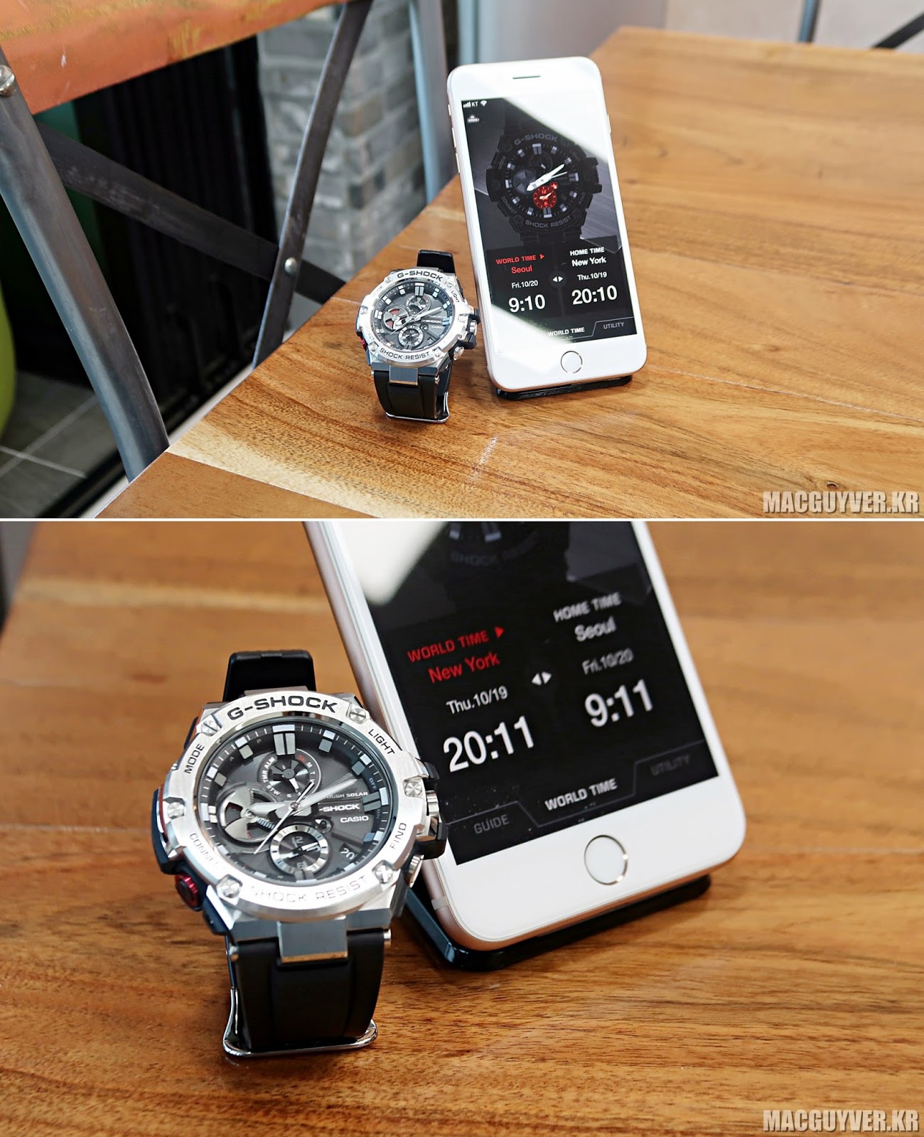 지샥에서 자체적으로 지원하는 지샥 커넥티드라는 앱을 통해 연동할 수 있는데, GST-B100의 왼쪽 아래에 있는 버튼을 2초간 꾹 누르게 되면 바로 연동이 시작되어서 세계 각국 도시별 시간을 바로 설정할 수 있고, 알람이나 타이머를 맞추는 것도 가능하다.