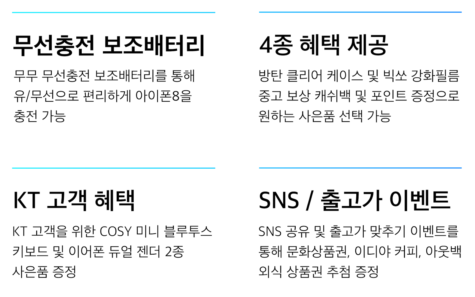 앞서 소개된 모든 사은품 및 혜택에 더해서 KT 고객의 경우는 추가로 받을 수 있는 혜택이 많다는 점에서 아이폰X, 아이폰8 사전예약을 하려는 경우라면 KT를 우선적으로 고려해보는 것도 좋을 것 같다.