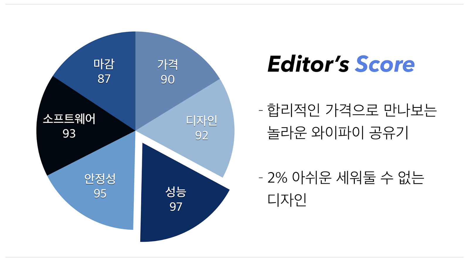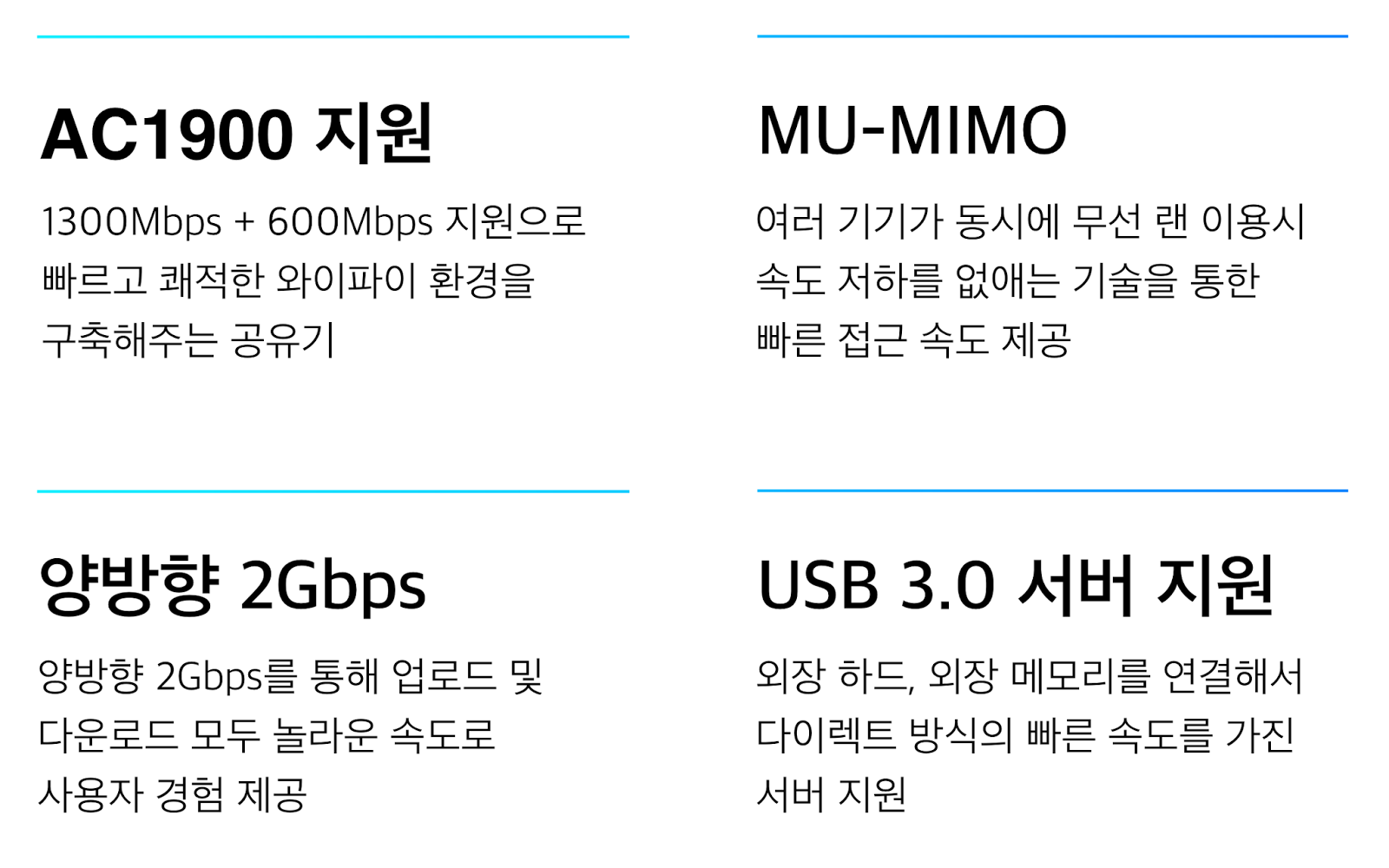 또한, 와이파이 공유기가 유선의 인터넷 속도를 그대로 전달해주는가도 매우 중요하다. 그에 더해서 다양한 기기를 연결하고 또 사용하기 때문에 기가 인터넷을 얼마나 효율적으로, 기기에 맞춰서 전달하는가도 중요한 포인트가 된다.