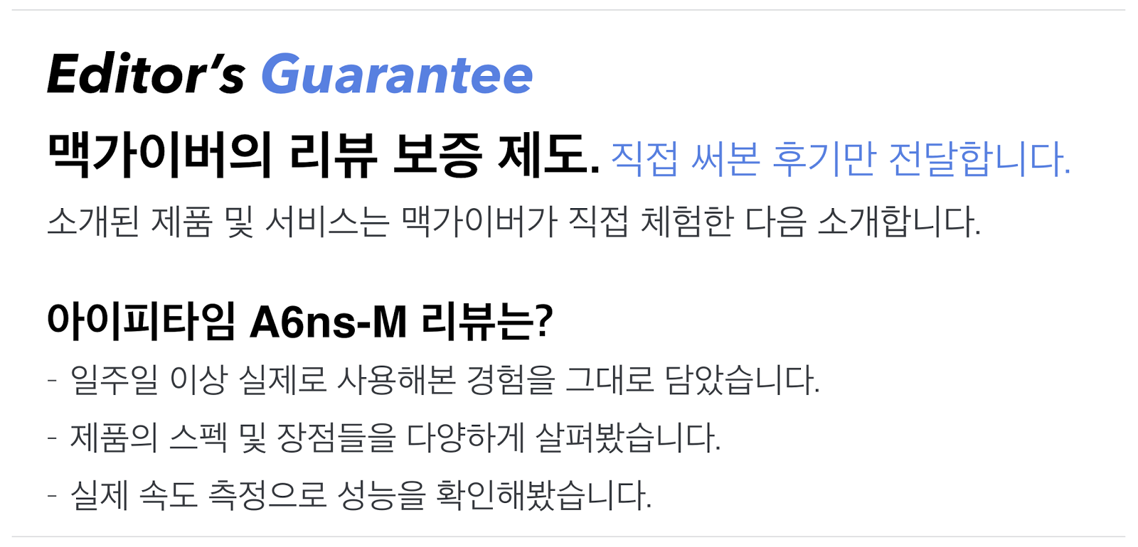 기가 인터넷을 사용 중이라면, 또한 기가 인터넷으로 바꿀 예정이라면 기가 와이파이를 넘어선 탄탄한 기본기를 갖춘 ipTIME A6ns-M 기가 인터넷 공유기를 선택해보는 것도 좋을 것 같다. - MACGUYVER.