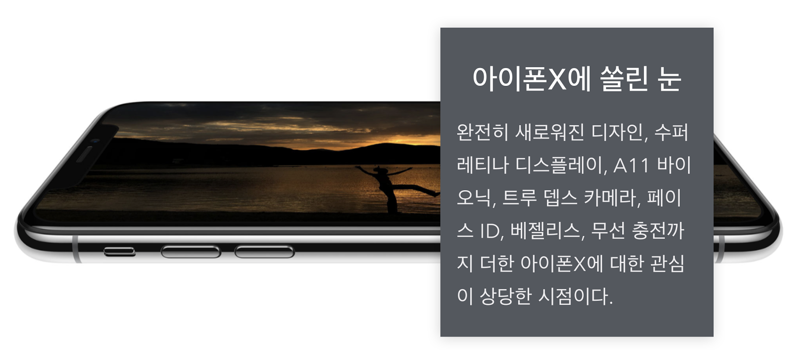 독특한 전면 디자인에 더해서 베젤리스 디자인을 선보인 첫번째 아이폰이기도 하고, 무엇보다 스티브 잡스를 떠올리게 만드는 스티브 잡스 극장에서 공개된 아이폰 10주년 기념작이라는 점에서 아이폰 마니아들의 호기심과 구매욕을 자극시키기에 충분했다.