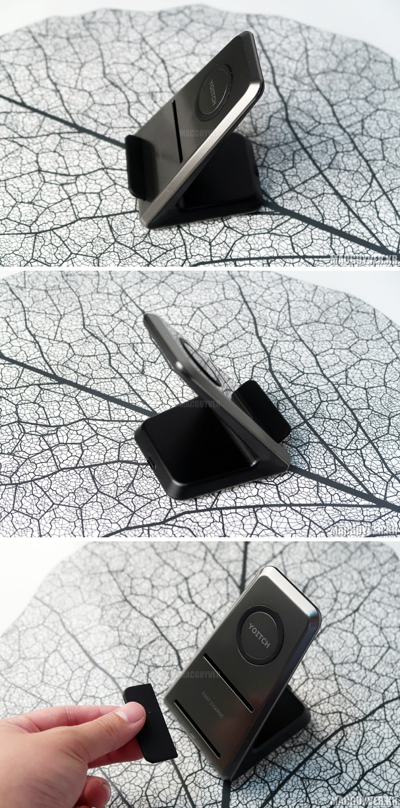 또한 차별점이 되는 거치 방식은 일반적인 무선 충전기와 달리 세워둘 수 있는 적절한 각도로 만들어져서 테이블이나 책상 위에 올려두고서 바라보면 정확히 화면이 잘 보이는 각도로 충전할 수 있다는 장점을 더했다.