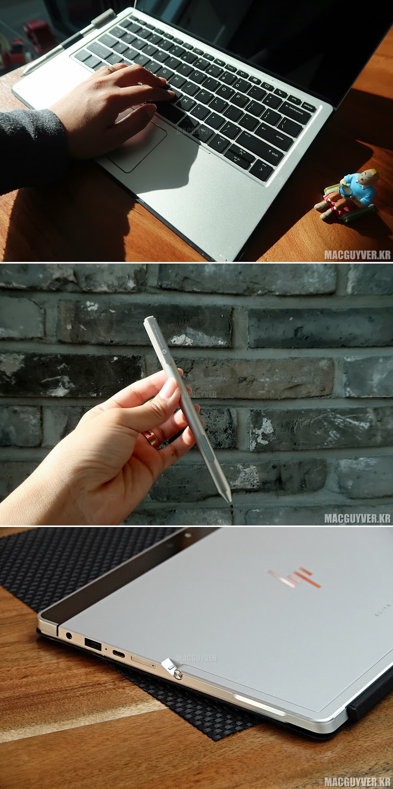 어디서나 터치 방식으로 HP 엘리트 X2 1012 G2를 활용하다가도, 타이핑을 해야 하는 경우, 혹은 스케치를 하려는 경우라면 트래블 키보드에서 와콤 펜만 분리하거나, 혹은 HP 엘리트 X2 1012 G2에 연결해서 빠르게 작업할 수 있기 때문에 투인원의 장점을 제대로 활용할 수 있을 것으로 기대되었다.