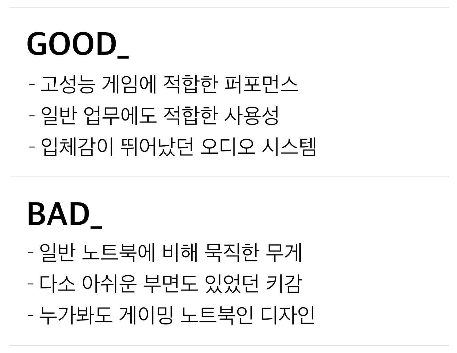 게임을 위한 도구로써는 여전히 크게 필요성을 못 느끼지만, 일반 노트북의 상위 버전으로써 게이밍 노트북 자체에 매력을 느끼게 되었다.