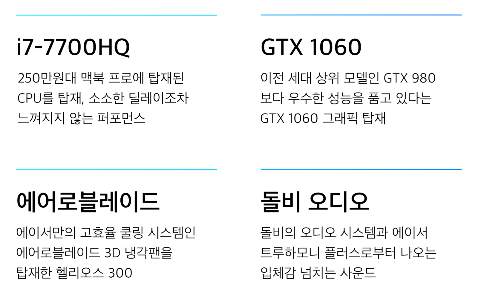 우선 7세대 인텔 코어인 i7-7700HQ를 품고 있다. 자주 본 건 아닌데 어디선가 본 적이 있는 듯한 넘버링이라면, 아마 맥북 프로의 스펙에서 봤을지 모르겠다. 약 250만원 대의 맥북프로에 탑재된 프로세서다.