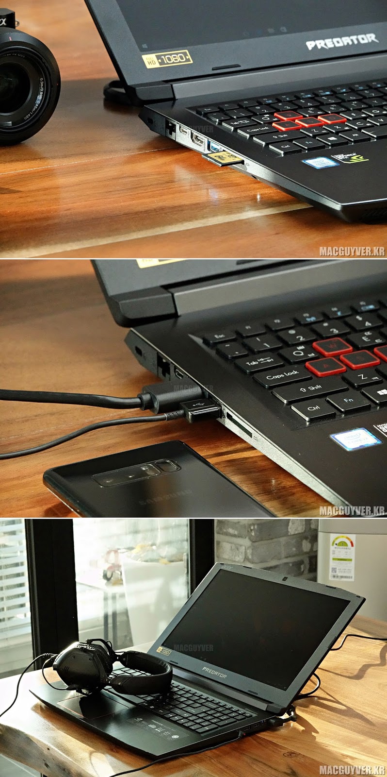 일반적인 A타입 USB 포트와 HDMI 2.0 포트들에 더해 USB-C 단자와 SD카드 슬롯까지 품고 있어서 확장성에서는 남부러울 것이 없었다. 다만 게이밍 노트북이다 보니 무게감에서는 엘지 그램이나 삼성 노트북9과 같은 일반 프리미엄 노트북들이 부럽기도 했다.