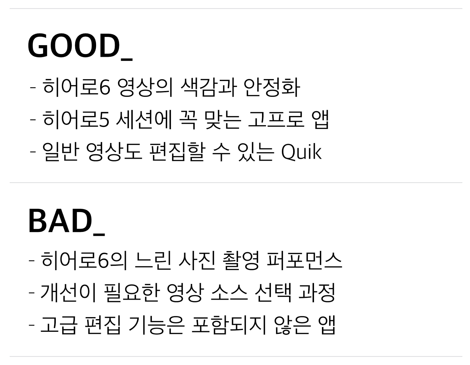 지난 1주일동안 히어로6를 줄기차게 사용해봤는데, 오늘은 누구나 안정적인 영상을 담을 수 있게 해주었던 고프로 히어로6, 고프로 앱과 사용하기에 특히 좋았던 히어로5 세션, 그리고 원터치로 영상을 편집해주었던 Quik앱에 대해 알아보도록 하자.