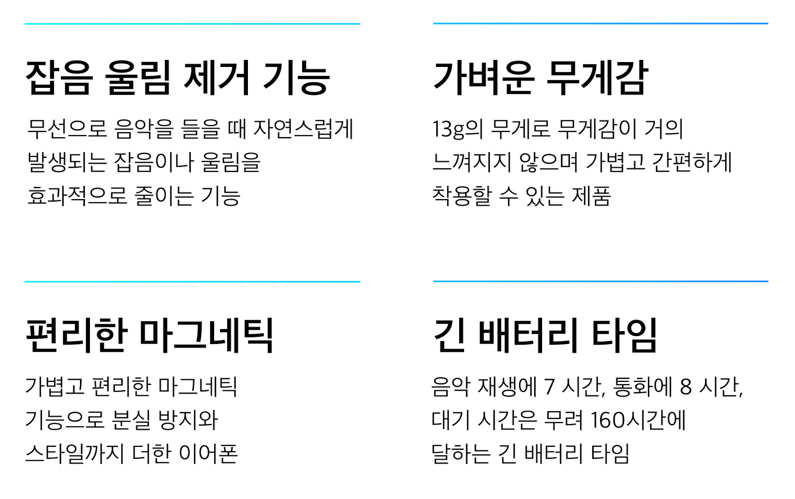 또한, 자동 페어링으로 한 번 연결한 기기는 똑똑하게 알아채서는 바로 연결해준다. 13g에 불과한 가벼운 무게도 장점이 되고, 잡음 울림 제거 기능 역시 덤으로 가지고 있다. 그래서 무선으로 음악을 들을 때 자연스럽게 발생되는 잡음이나 울림을 효과적으로 줄일 수 있다.