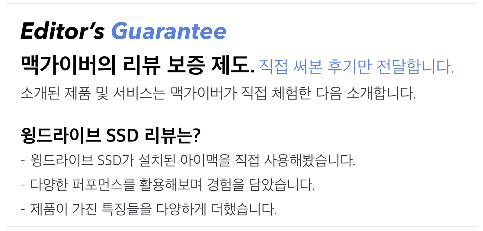 기존 저장 장치에 더해서 새롭게 더하는 윙드라이브 SSD를 통해서 아이맥의 수명을 더하고, 놀라운 퍼포먼스까지 활용하고 싶은 분들이라면 ‘윙드라이브 SSD’에 대해서 조금 더 알아볼 것을 추천한다. - MACGUYVER.