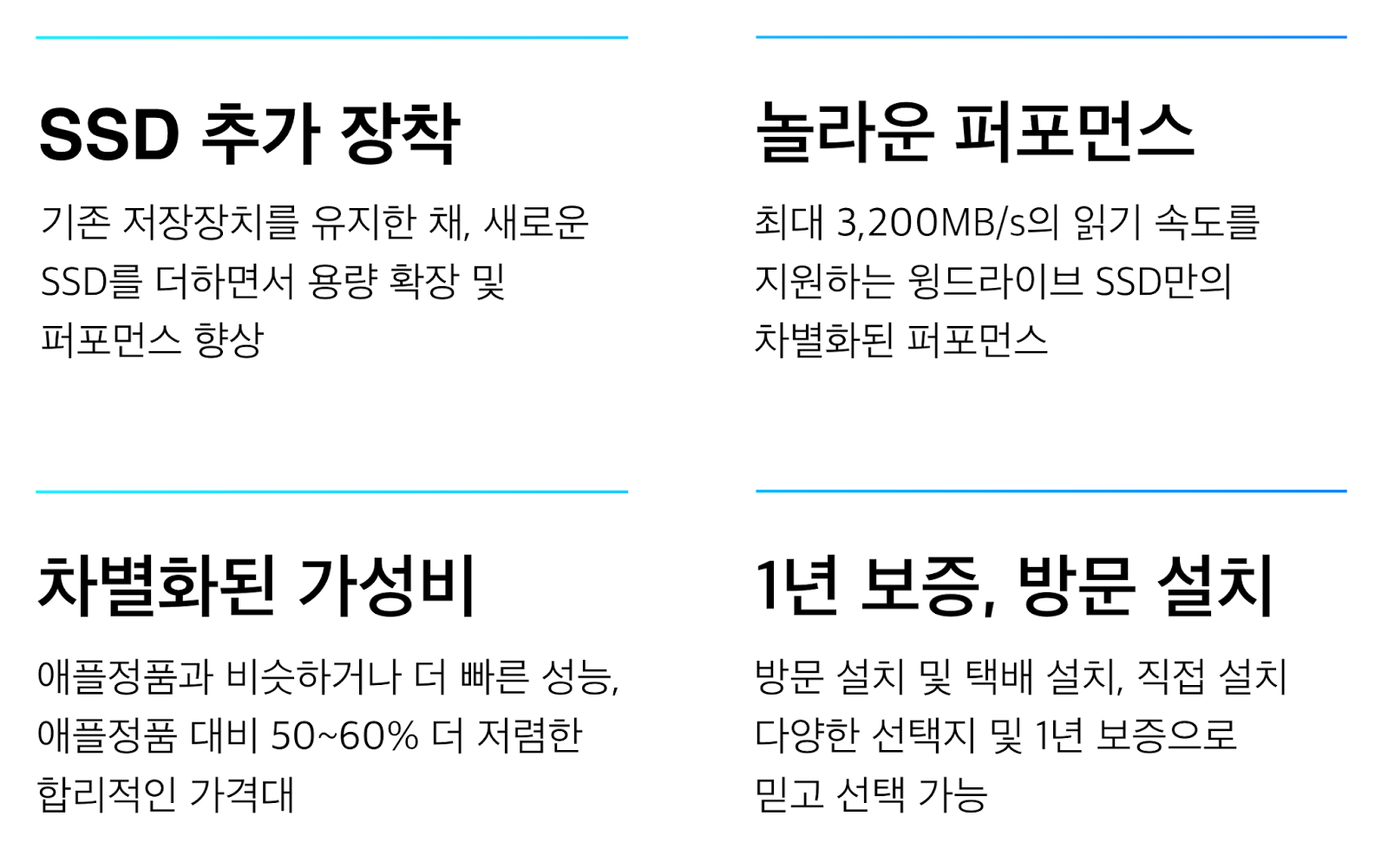 ✎ 3,200MB/s의 읽기 속도를 통해서 애플 정품과 동일하거나 더 빠른 속도로 업그레이드가 되었던 윙드라이브의 SSD