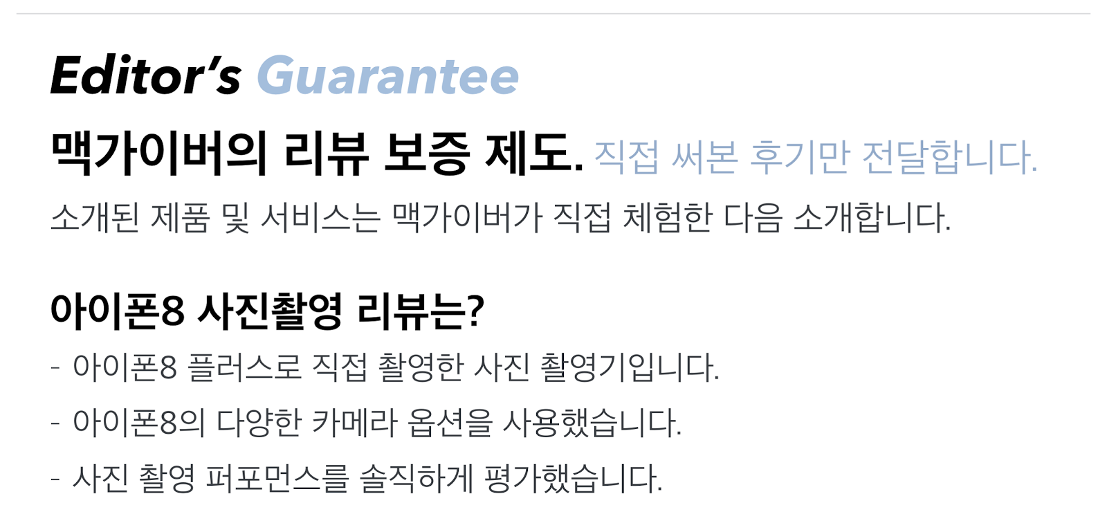 스마트폰 카메라의 한계를 점점 벗어나려는 애플의 이러한 시도는 2개의 렌즈를 어떻게 활용할지, 카메라 이미지 센서를 새롭게 다듬으면서 무엇이 가능한지, A11 바이오닉 칩셋으로 사진을 찍는 매 순간 1천억 번의 계산으로 어떠한 결과물을 보여줄지를 기대하게 만들었다는 점에서 충분히 써도 좋을 카메라가 아닐까 싶었다. - MACGUYVER.