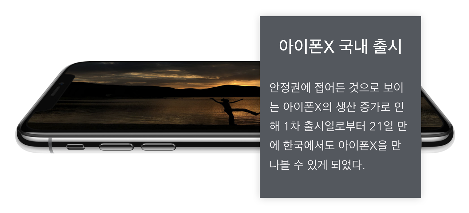 그럼에도 기대했던 것보다 더 빨라진 아이폰X의 한국 출시는 해외 직구 대신 조금만 기다리면 공식적으로 한국에서도 구입이 가능하다는 것을 뜻하며, 국내 시장에 애플이 조금 더 관심을 가지고 있다는 것을 보여주는 것은 아닐까 하는 생각이 들게 만들었다. - MACGUYVER.