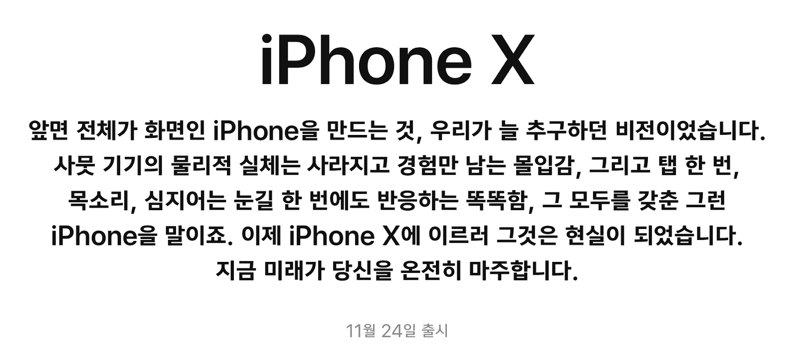 누군가는 애타게 기다리던 소식일지 모른다. 담달폰에서 내년폰으로도 불리던 아이폰X의 공식 출시일이 오는 11월 24일로 확정되었기 때문이다. 이 소식은 애플의 공식 홈페이지를 통해서 먼저 조용하게 알려졌는데, 아이러니하게도 뉴스 보다도 공식 홈페이지를 통해서 먼저 알려졌다.