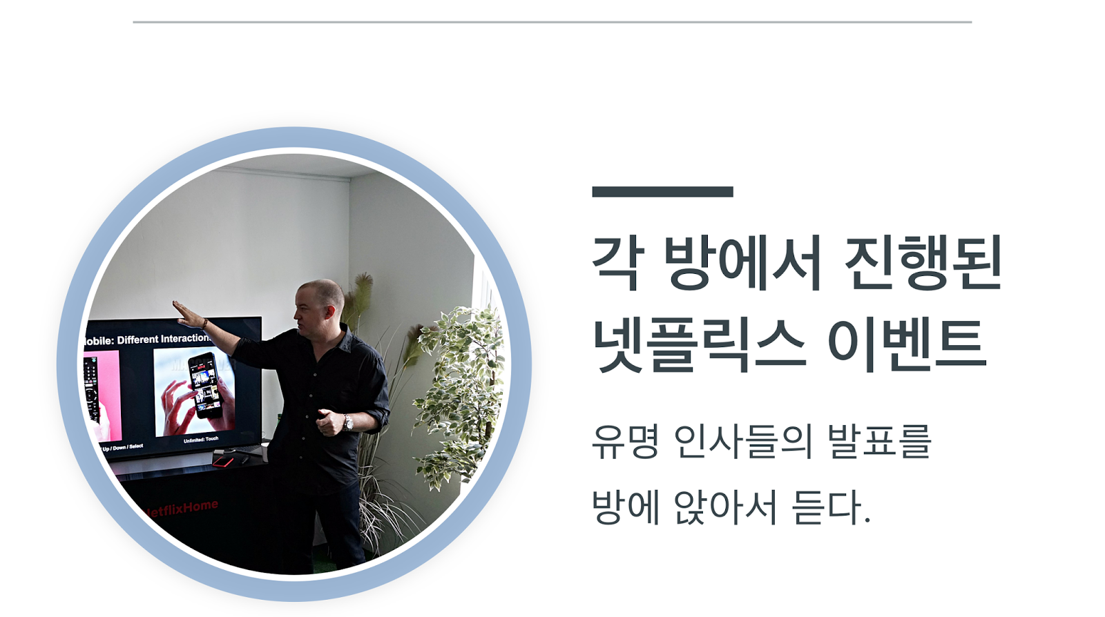 이벤트 현장이라는 단어를 사용하기에도 애매하지만, 아무튼 이 곳은 평소 다양한 사람들이 자신의 집에서 넷플릭스를 즐기는 공간 위주로 구성되어 있었는데, 우선 거실에서 TV로 간단한 브리핑을 하고, 이후 2층 3층의 각 방에서 이벤트가 진행되었다.