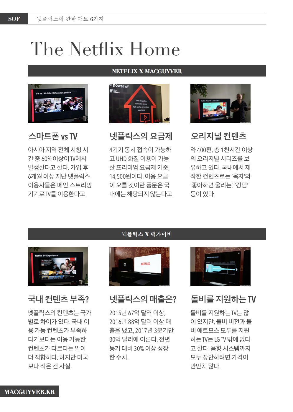 그럼에도 넷플릭스는 소비자들로 하여금 이동 중의 스마트폰, 카페에서 노트북, 거실의 스마트TV까지, 원하는 장소에서 원하는 기기로 최상의 컨텐츠를 즐길 수 있도록 노력하고 계속 발전하고 있다는 점에서, 그리고 그러한 결실을 명확한 숫자로 보여주고 있다는 점에서, 앞으로가 더욱 기대되는 기업이라고 볼 수 있을 것 같다. - MACGUYVER.