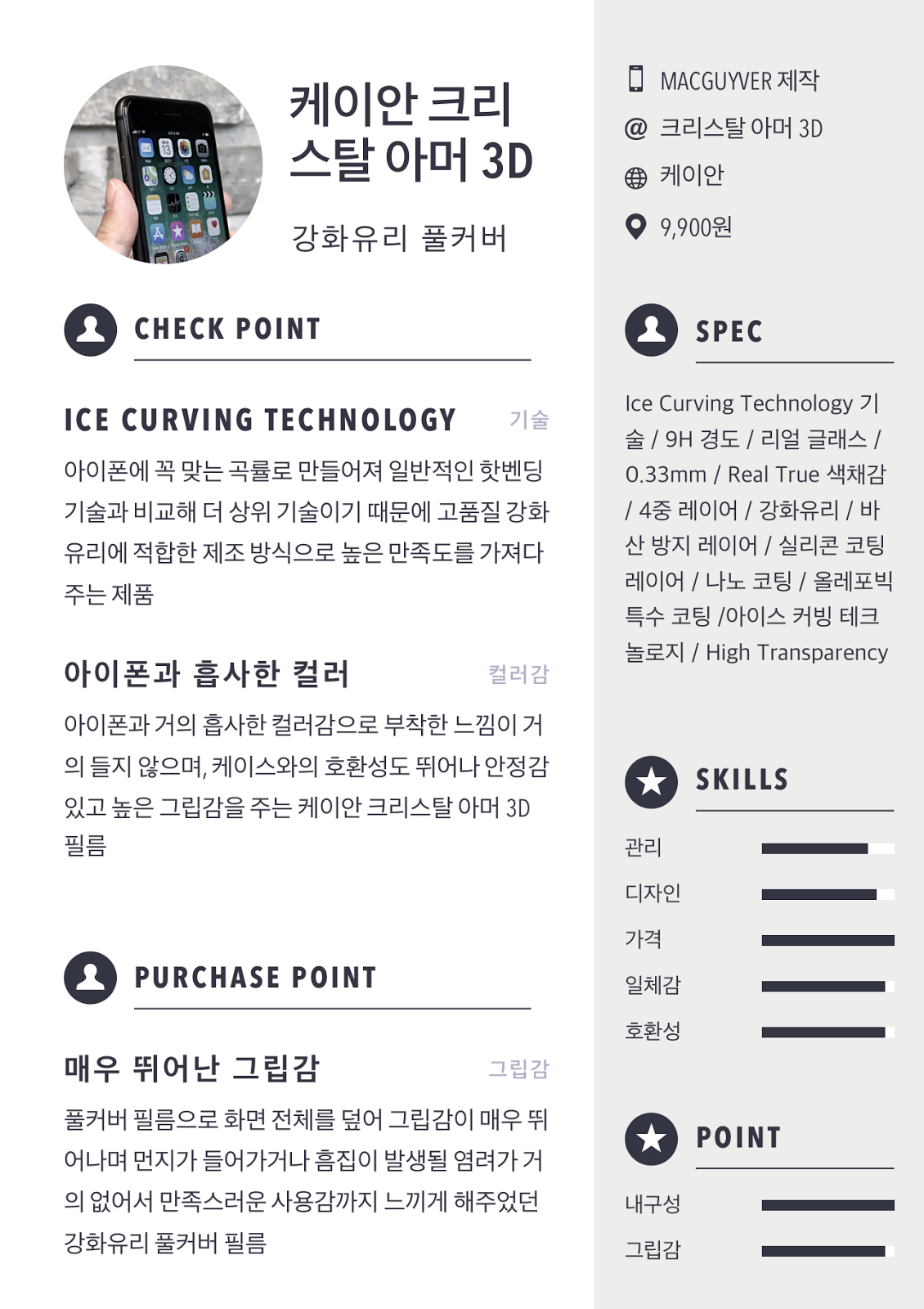 ✎ 전체적인 일체감이 높다는 점, 그리고 블랙과 화이트 컬러로 마감되어 있다는 점, 풀커버로 되어 있다는 점에서 높은 점수를 줄 수 있었던 케이안 크리스탈 아머 3D 아이폰8 강화유리