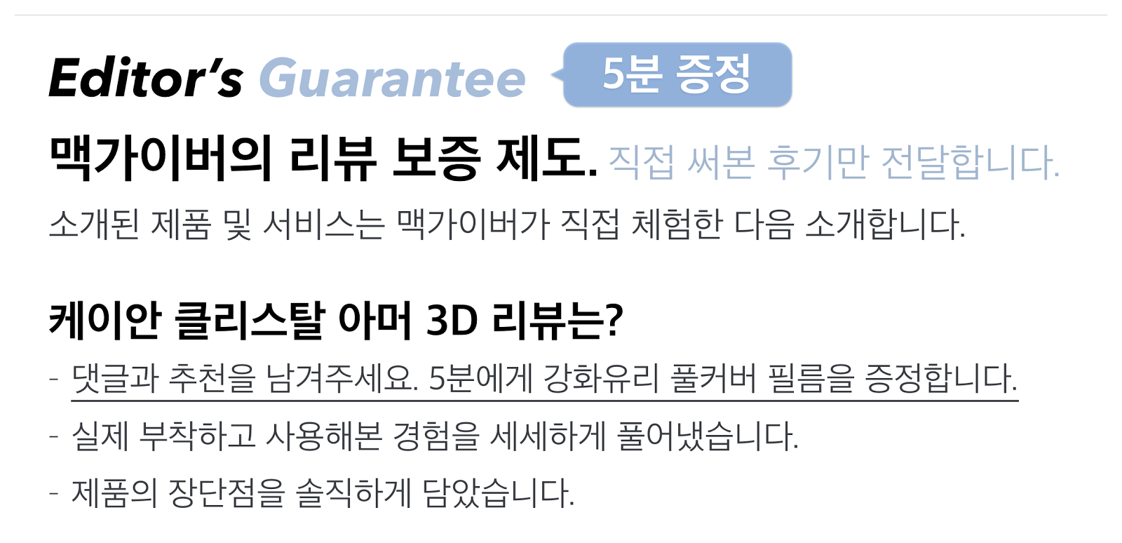 그러나, 다른 대안이 없다는 점에서 어쩔 수 없이 보호필름이나 강화유리를 선택해야만 한다면 차선책으로 만족스러운 제품을 선택할 필요가 있다.